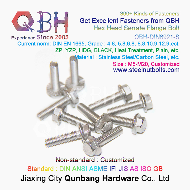 QBH DIN6921 M5-M20 Blue White Zinc Plated / Black / Plain Carbon / Stainless Steel Serrated Flange Self-Locking Bolt Images |